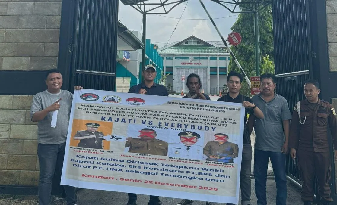 KENDARI, KABARTERKINISULTRA.COM – Puluhan massa aksi yang tergabung dalam Konsorsium Selamatkan Sumber Daya Alam geruduk kantor Kejaksaan Tinggi (Kejati) Sulawesi Tenggara (Sultra), Senin (22/12/2025).