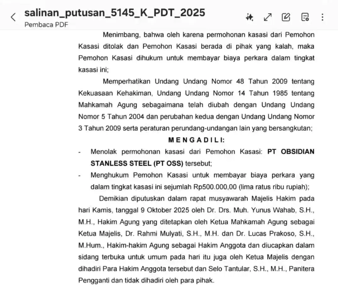 PT OSS yang tidak puas dengan putusan PT Sultra, kembali mengajukan kasasi di MA. Akan tetapi, upaya tersebut ternyata mental, setelah ditolak oleh MA.